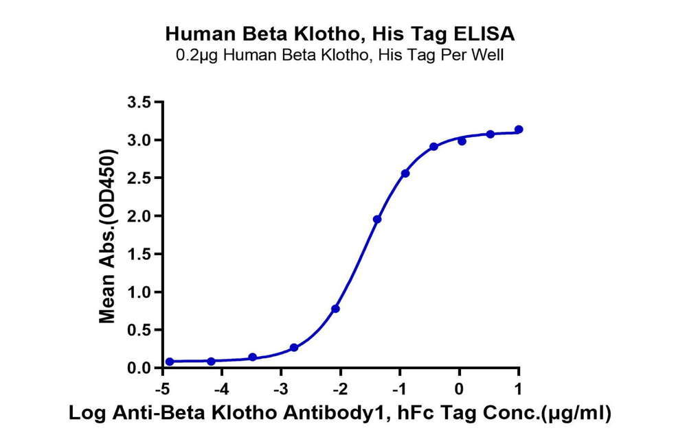 Figure 1. Our recombinant human β-Klotho protein exhibits excellent binding ability with its antibody (left graph, ELISA) and ligand FGF21 (right graph, SPR).