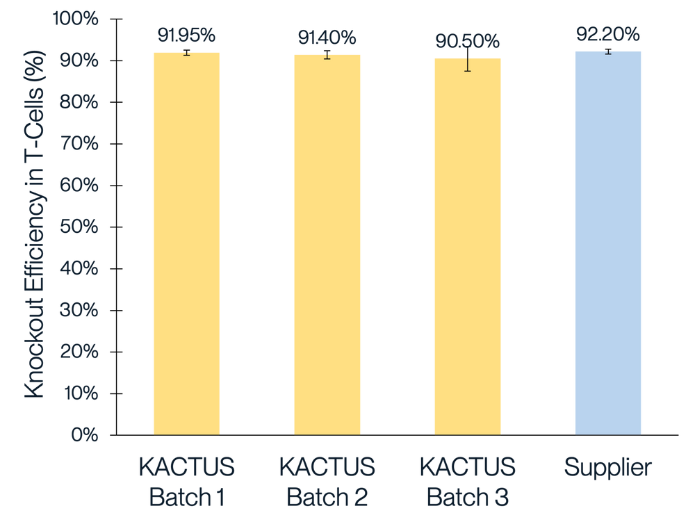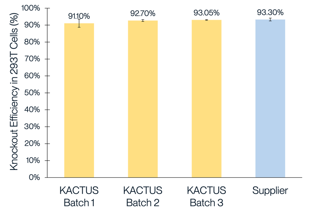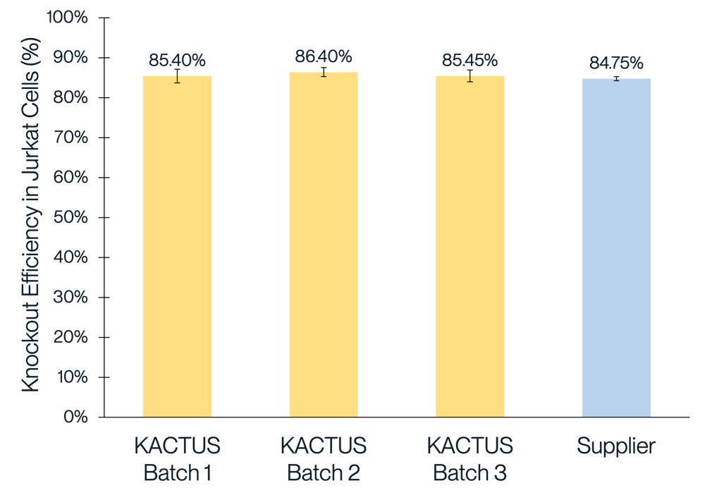 When electroporated with sgRNA, KACTUS Cas9 demonstrates editing efficiencies greater than 85 percent in several tested target genes in human 293T cells, Jurkat cells, and primary T cells. Editing efficiency will vary depending on the target gene.