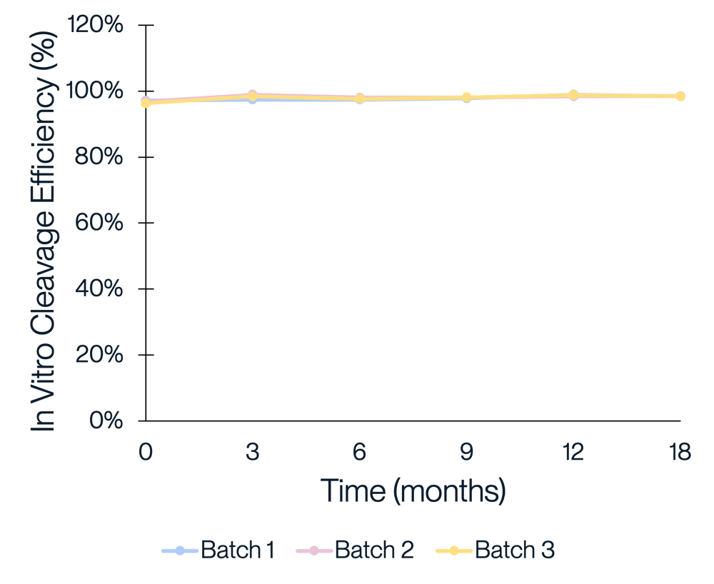 Figure 4. Consistent purity and activity performance was observed across three manufacturing batches of KACTUS GMP-grade Cas9. Three batches of KACTUS GMP-grade Cas9 were stored at -20°C for long-term stability testing. Purity and in vitro cleavage activity were analyzed at 3, 6, 9, 12, 15, 18 months, respectively. Results show our GMP-grade Cas9 has a good stability and consistent activity across time and different manufacturing batches.