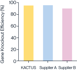 Figure 3. Gene knockout efficiency of BCL11A in hematopoietic stem cells (HSCs) for the treatment of β-thalassemia using Cas9 nucleases from KACTUS and two leading suppliers. Results demonstrate that KACTUS Cas9 nuclease achieves gene knockout efficiency comparable to that of the leading suppliers, validating its effectiveness for therapeutic applications.