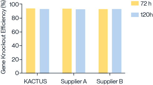 Figure 2. Comparison of gene knockout efficiency using Cas9 nucleases from KACTUS and two leading suppliers in UCAR-T cells. Gene knockout efficiency was assessed at 72 hours and 120 hours post-electroporation. Results indicate that KACTUS Cas9 nuclease performs comparably to leading suppliers, effectively knocking out genes related to immune rejection reactions on donor T cells.