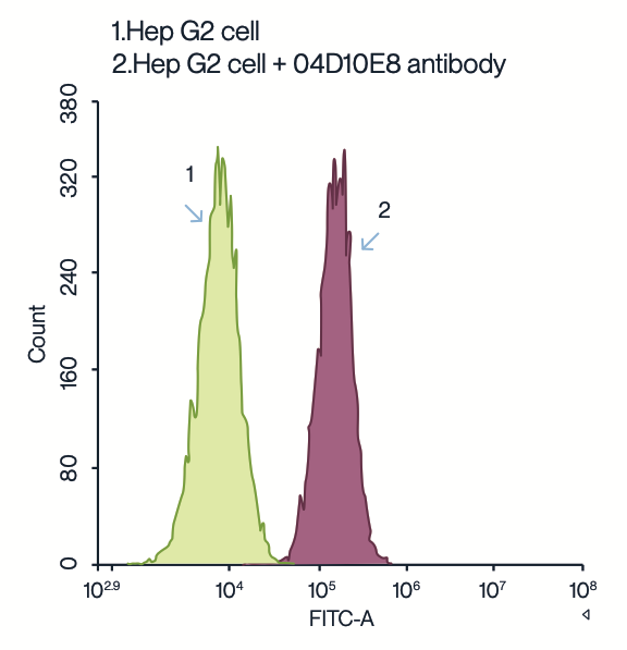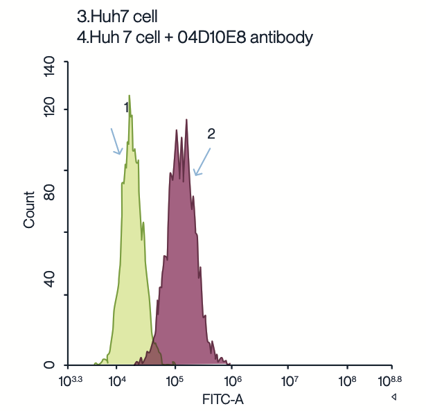 Figure 5. HepG2 and Huh7 cell lines overexpressing SLC13A5 were used for FACS. HepG2 and Huh7 cell lines (2E+06 cells/mL) were incubated with 10 nM recombinant 04D10E8 antibody. Following incubation, cells were labeled with an anti-mouse FC-FITC secondary antibody. The green peaks (1 and 3) represent the autofluorescence of untreated HepG2 and Huh7 cells, respectively. The red peaks (2 and 4) show the fluorescence intensity of HepG2 and Huh7 cells bound with the 04D10E8 antibody. This data demonstrates the binding specificity and expression level of the SLC13A5 membrane protein in these cell lines.