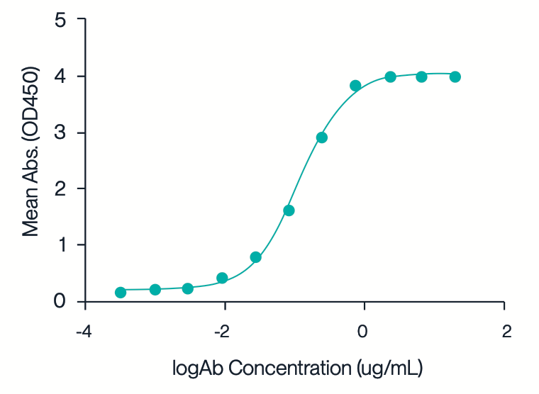 Figure 4. SLC13A5 nanodisc was tested via ELISA using 11H7B8 antibody. The plate was coated with human SLC13A5 nanodisc at 5 µg/mL, and the binding interaction was assessed using a colorimetric assay. The mean absorbance (OD450) was measured across varying concentrations of the antibody, resulting in an EC50 value of 0.14 µg/mL.