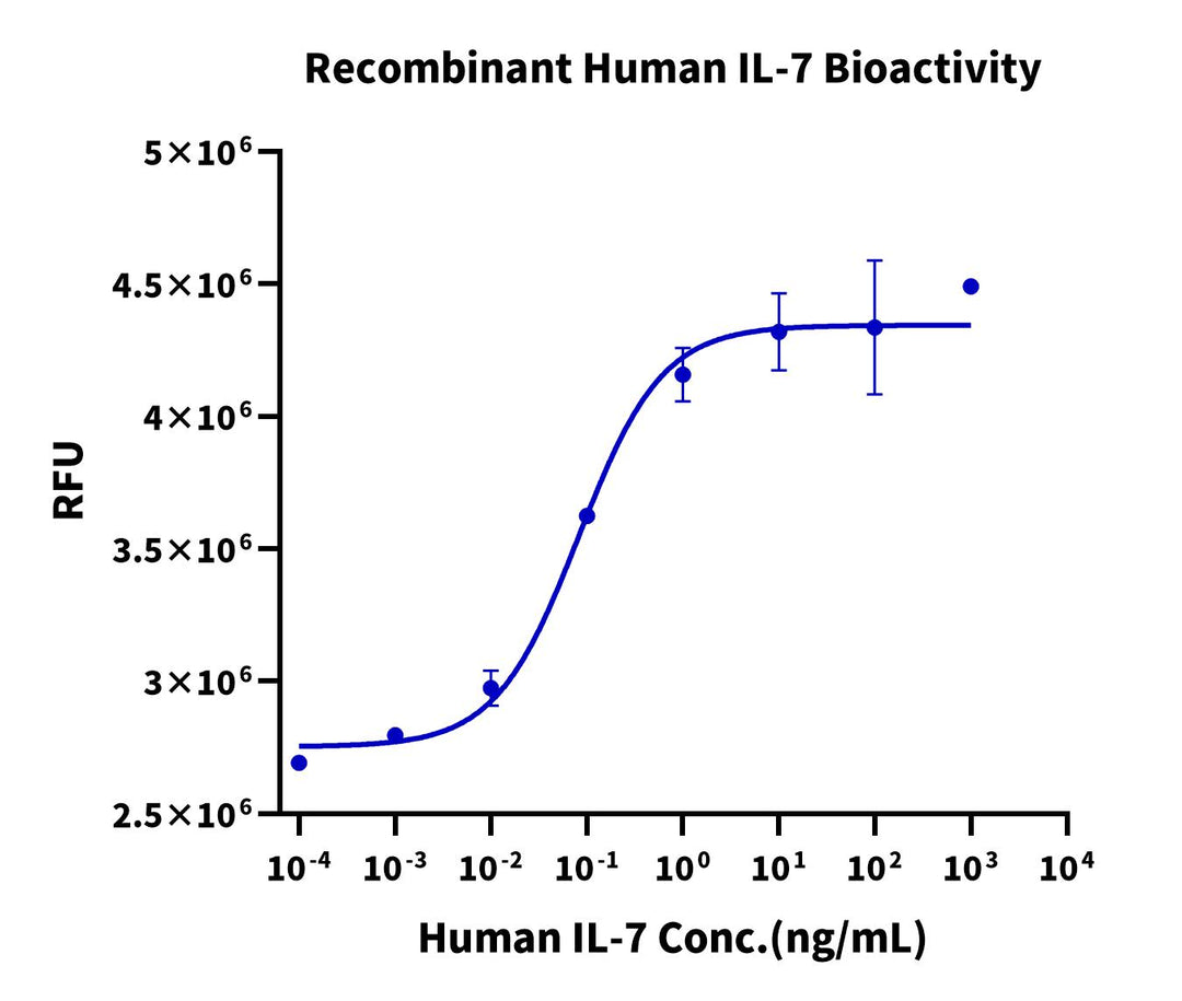 Cell level experiments verified that Human IL-7 Protein can promote the proliferation of 2E8 cells. Bioactivity was measured in a cell proliferation assay using murine 2E8 cells. The ED50 for this effect was 0.1 - 0.5 ng/mL.