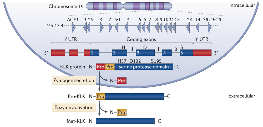KLK2 (hK2) is a highly prostate-specific serine protease that shares 80% amino acid homology with PSA (KLK3) and acts as its primary physiological activator. Regulated by androgen receptor signaling, it is overexpressed throughout the prostate cancer disease continuum (including metastatic castration-resistant stages) where it facilitates tumor growth, migration, and angiogenesis. Beyond its role as a diagnostic biomarker, the recent discovery of its cell surface expression has established KLK2 as a promising therapeutic target for radioligand and CAR T-cell therapies.