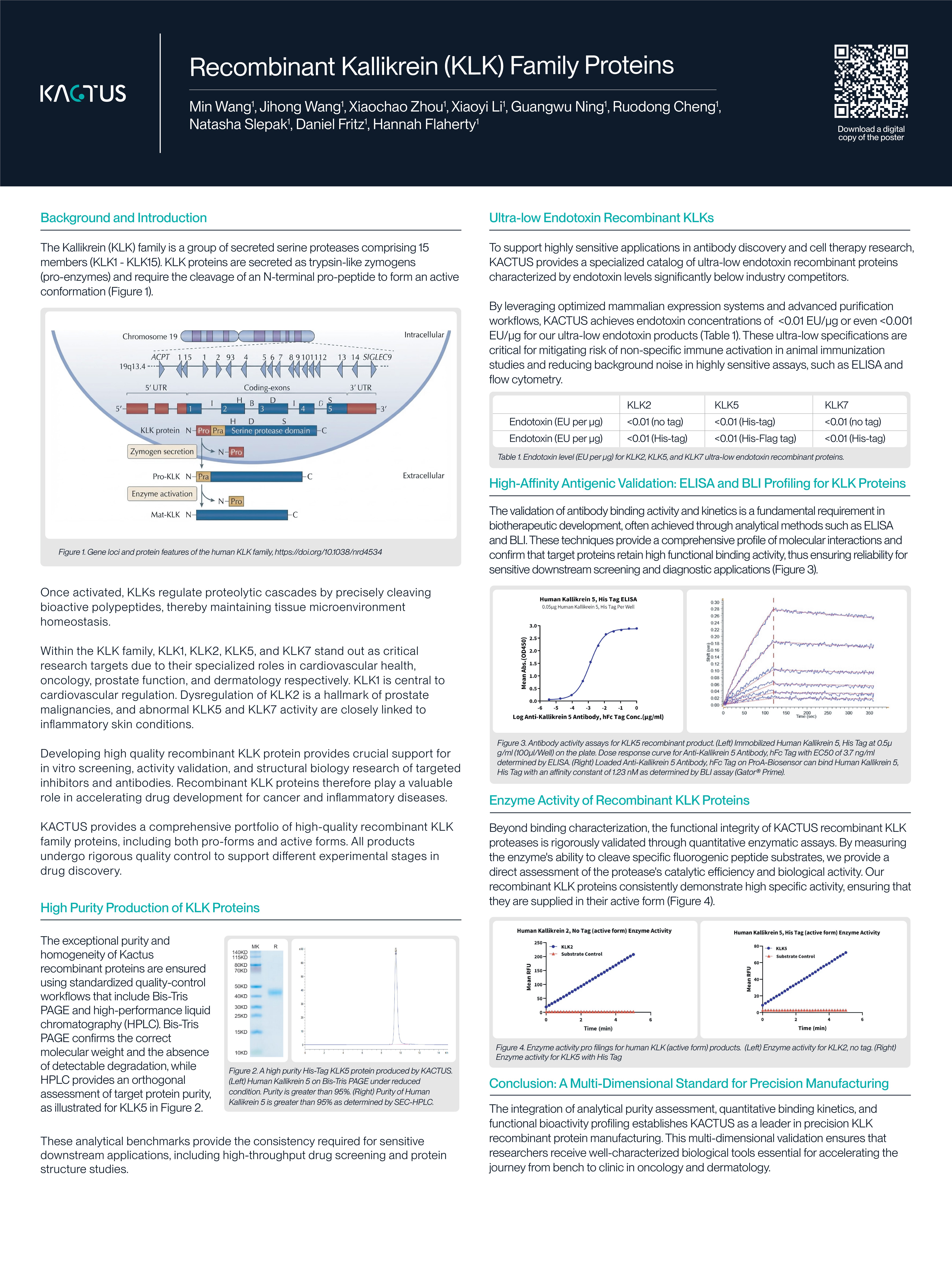The Kallikrein-related peptidase (KLK) family is comprised of 15 secreted serine proteases (KLK1–KLK15), synthesized as inactive zymogens (pro-forms). Upon cleavage of their N-terminal pro-peptide, KLKs adopt an active conformation and precisely cleave peptide substrates to regulate proteolytic cascades essential for tissue homeostasis.