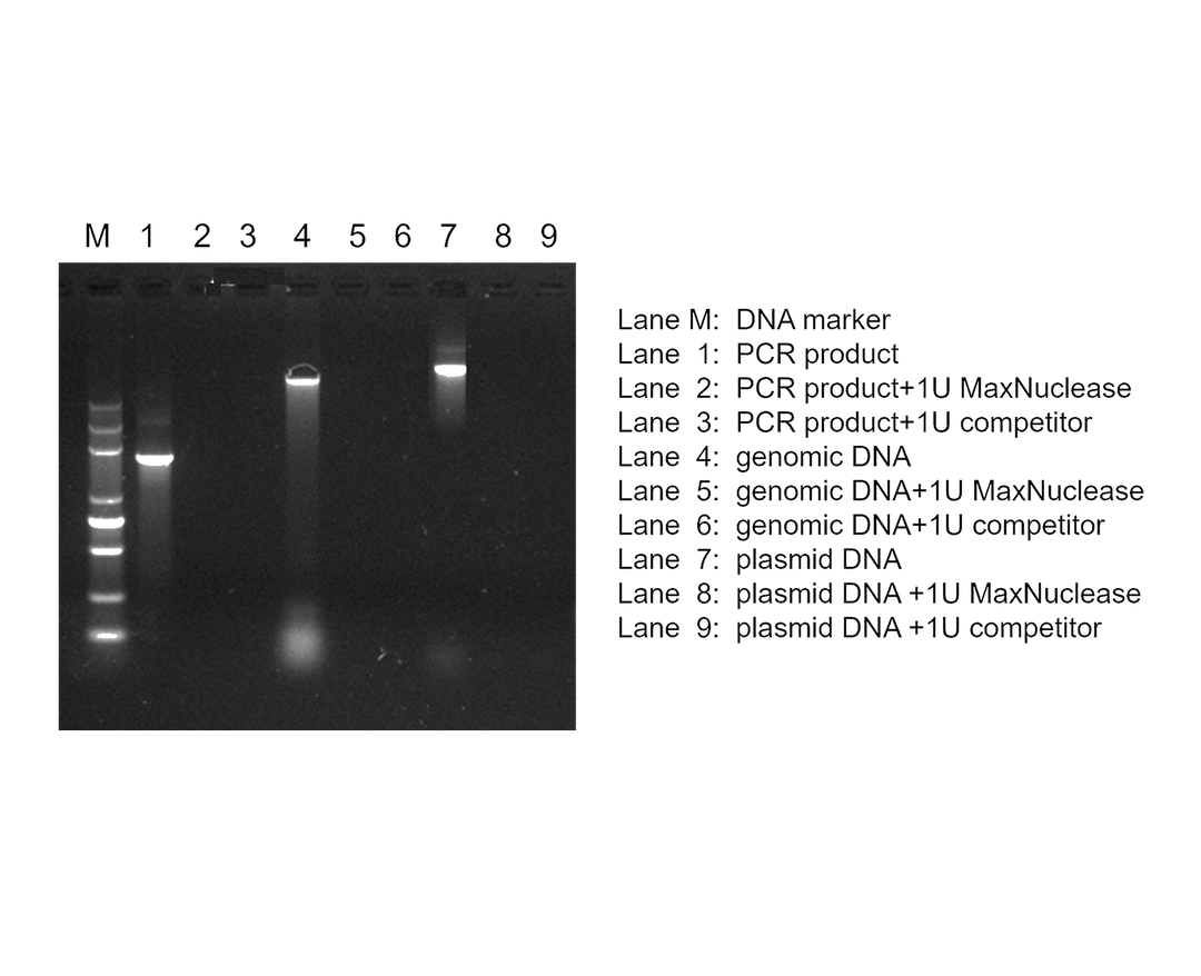 MaxNuclease™ degrades all forms of nucleic acids including single-stranded and double-stranded DNA and RNA, whether linear, circular, plasmid, genomic, or PCR-amplified.