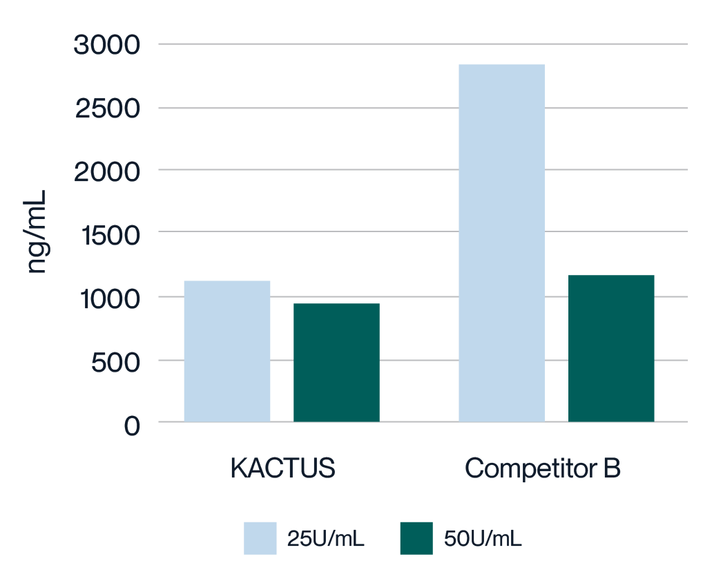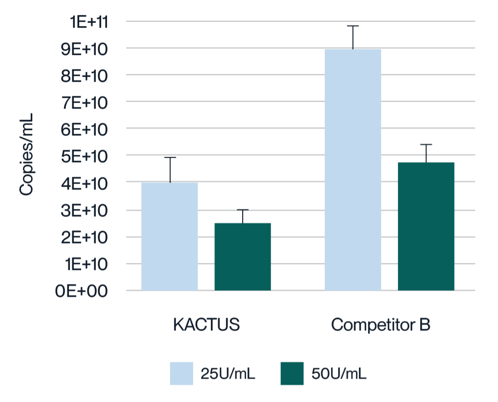 Virus harvest solution was treated with 25U/mL and 50U/mL endonuclease at 37°C for 2 hours, respectively. Detection of plasmid DNA (pDNA) residue was analyzed. MaxNuclease™ has higher degradation activity versus Competitor B demonstrated by lower pDNA residue for both 25U/mL and 50U/mL working concentrations.