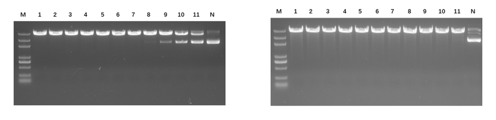 Figure 2. (Left) BsaI enzyme activity detection. 1μg of plasmid was added to a 20 μL system, along with 1 μL BsaI (well 1 is undiluted, wells 1-11 are serial 2-fold dilutions), and digested for 30 minutes. The enzyme activity is ≥20 kU/mL. (Right) BsaI star activity detection. 1 μg of plasmid is added to a 20 μL system, along with 1 μL BsaI (well 1 is undiluted; wells 1-11 are serial 2-fold dilutions) and digested for 16 hours. No star activity is observed.