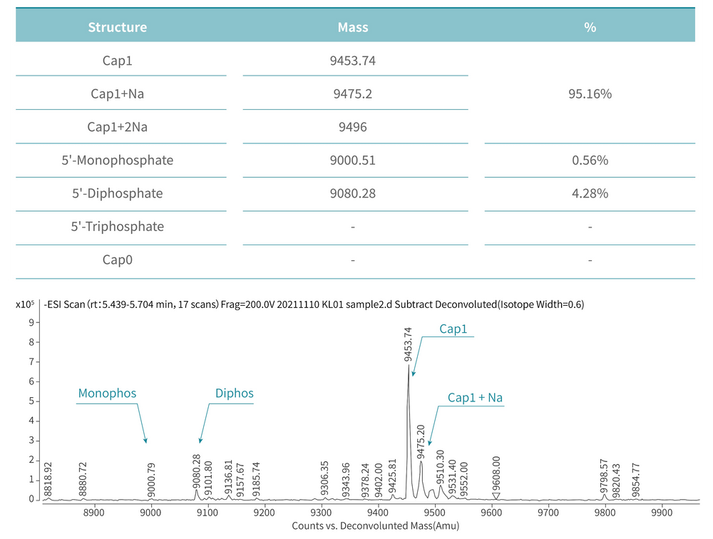 Figure 4. mRNA is capped with Cap1 structure using Vaccinia Capping Enzyme and mRNA Cap 2´-O-Methyltransferase from KACTUS. The capping rate is 95.16% detected via our LC-MS platform. (Note: The capping rate is related to the performance of the enzyme and factors such as the secondary structure of mRNA.)