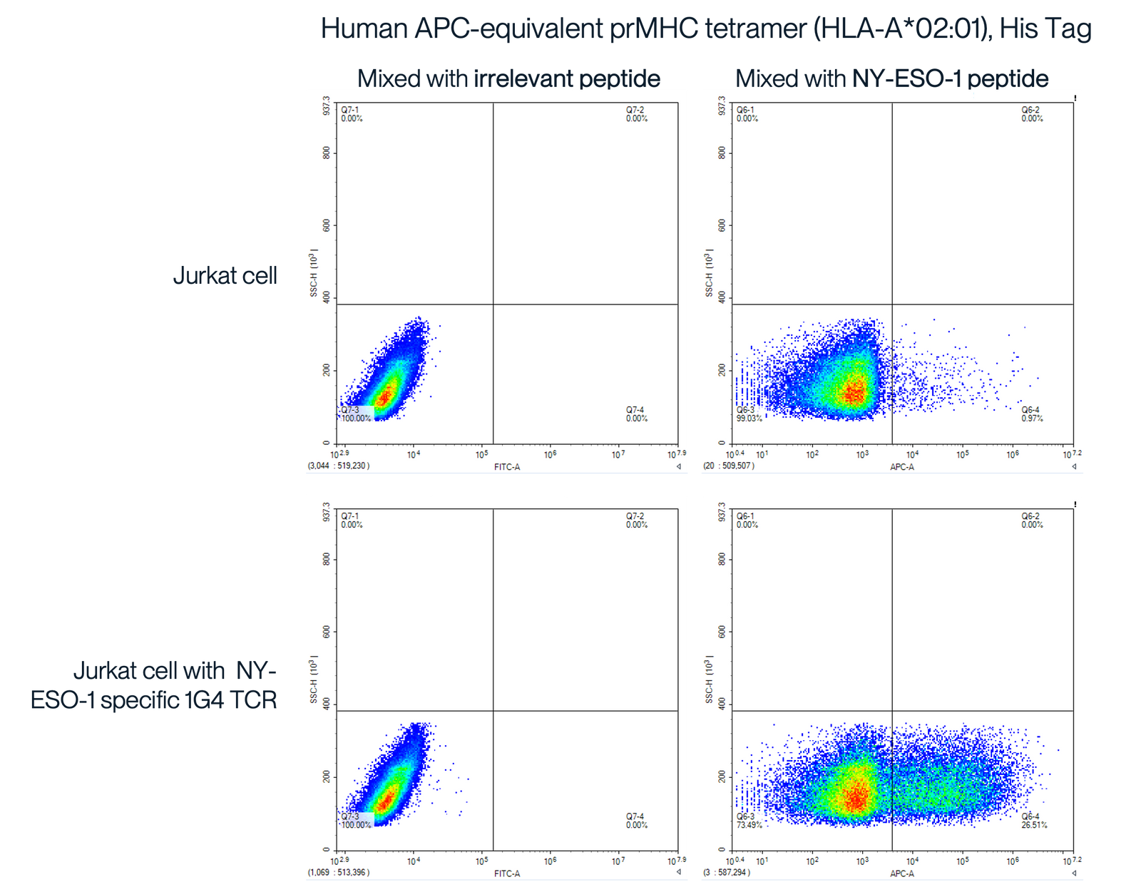 Figure 2. Flow cytometry analysis of Jurkat Cells with Human APC-equivalent prMHC Tetramer (HLA-A*02:01), His Tag. Results demonstrate specific binding of the MHC-peptide complex to the NY-ESO-1 specific TCR, with a significant increase in APC-positive cells in the presence of the MHC loaded with NY-ESO-1 peptide.