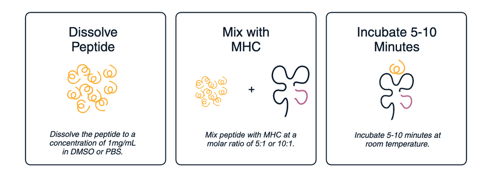 Our prMHCs can be loaded in your laboratory with a quick 3-step loading protocol. The peptide is dissolved in DMSO or PBS, mixed with the prMHC at a molar ratio of 5:1 or 10:1, and then incubated for 5-10 minutes at room temperature.