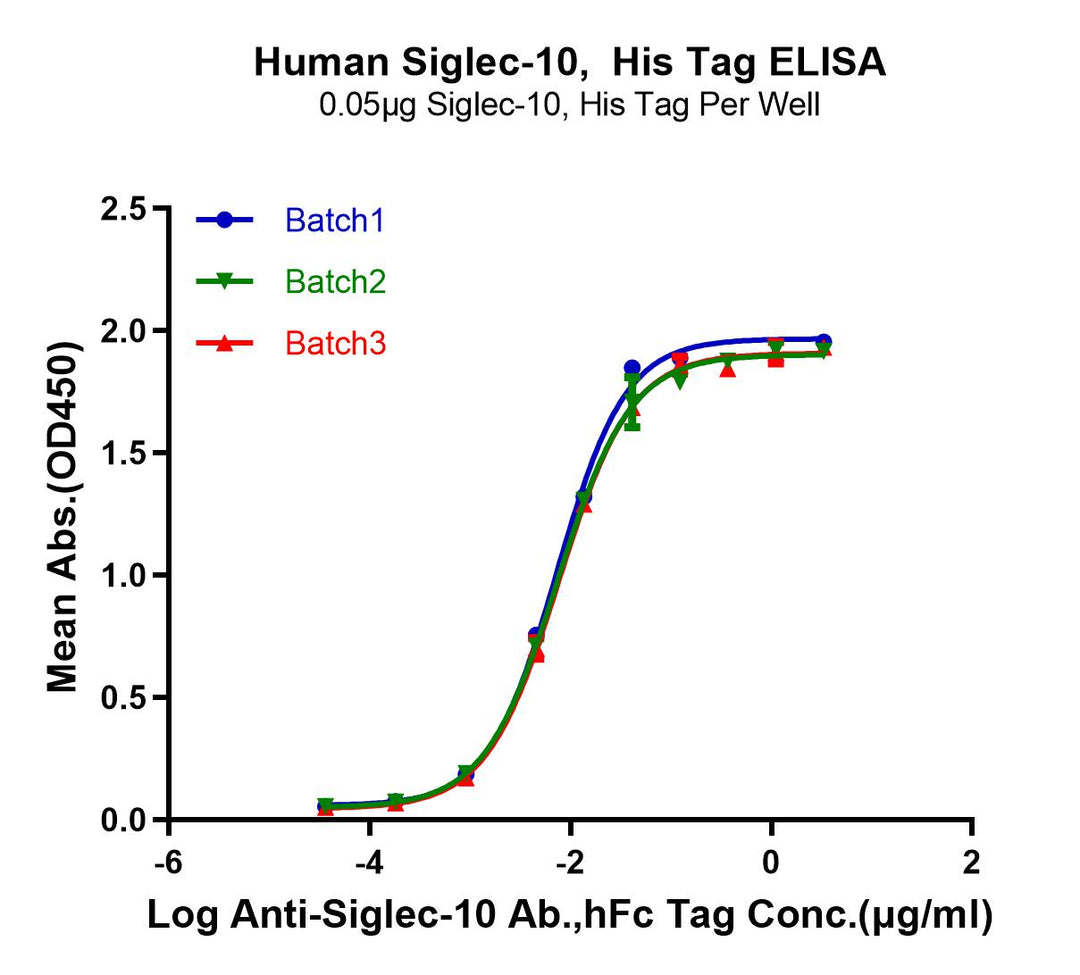 Immobilized Human Siglec-10, His Tag at 0.5μg/mL (100μL/well). Dose response curve for Anti-Siglec-10 Ab., hFc Tag with an EC50 of 7.3, 7.7, and 7.4ng/mL, respectively, asdetermined by ELISA.