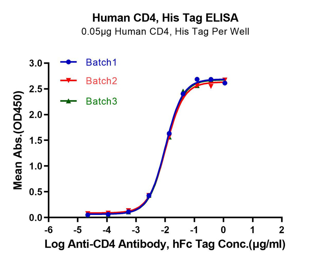 Immobilized Human CD4 at 0.5μg/mL (100μL/well) on the plate. Dose response curve for Anti-CD4 Antibody, hFc Tag with an EC50 of 10.2, 10.6, 10.6ng/mL, respectively, as determined by ELISA.