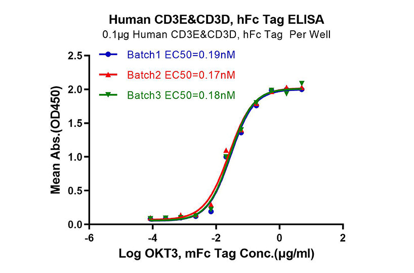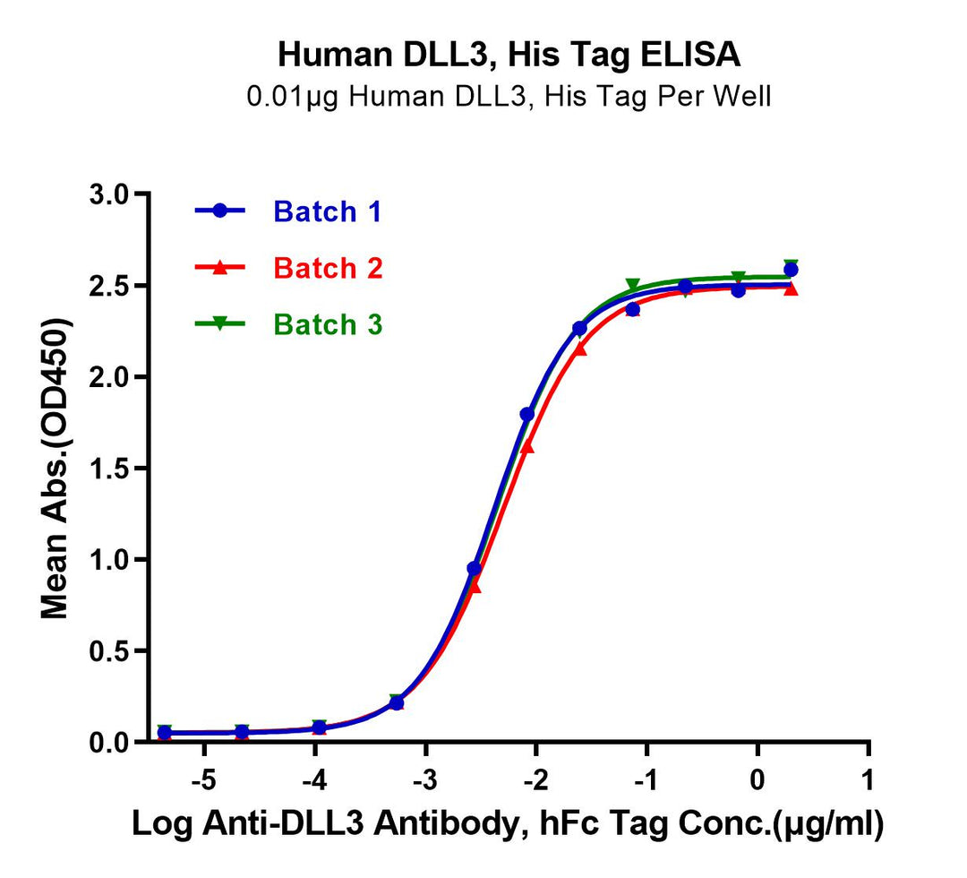 Immobilized Human DLL3, His Tag at 0.1μg/mL (100μL/well) on the plate. Dose response curve for Anti-DLL3 Antibody, hFc Tag with an EC50 of 5.0, 4.5, and 5.0ng/mL, respectively, as determined by ELISA.