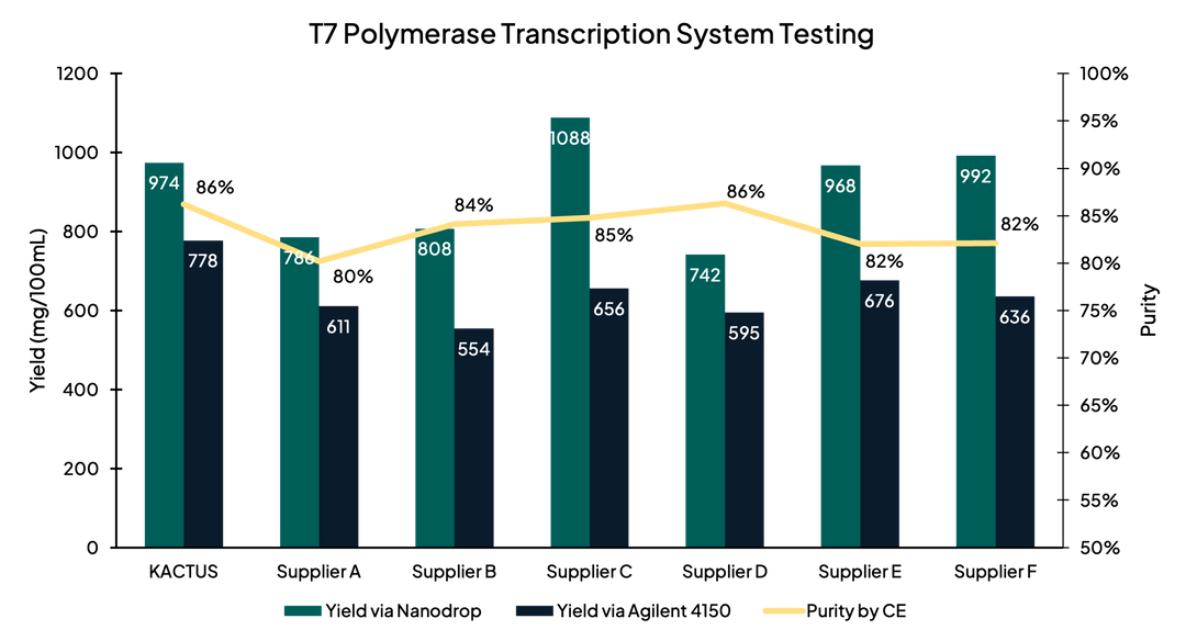 Figure 3. After synthesis of mRNA, in vitro transcription yield of T7 RNA Polymerase measured with Agilent 4150 Tapestation. KACTUS T7 had 65% higher yield than leading supplier.