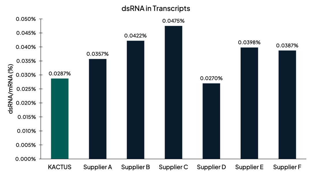 Figure 2. dsRNA measured after in vitro transcription using J2-based ELISA. KACTUS T7 has low dsRNA contamination comparable or superior to leading competitors.