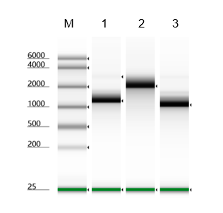 Figure 3. After synthesis of mRNA, in vitro transcription yield of T7 RNA Polymerase measured with Agilent 4150 Tapestation. KACTUS T7 had 65% higher yield than leading supplier.