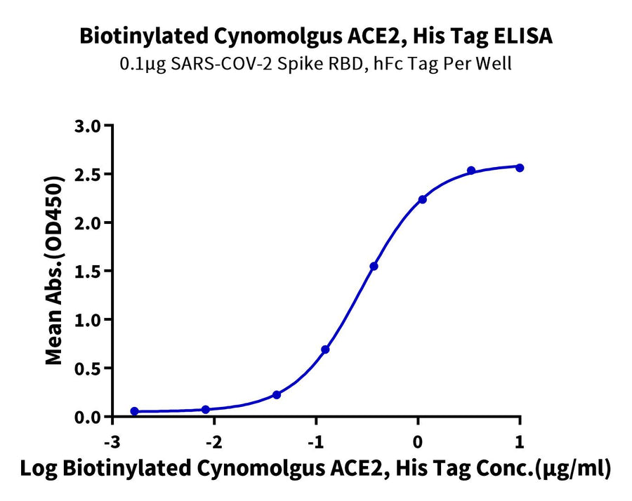 - Activity: Immobilized SARS-COV-2 Spike RBD, hFc Tag at 1ug/ml (100ul/well) on the plate. Dose response curve for Biotinylated Cynomolgus ACE2, His Tag with the EC50 of 0.28ug/ml determined by ELISA.