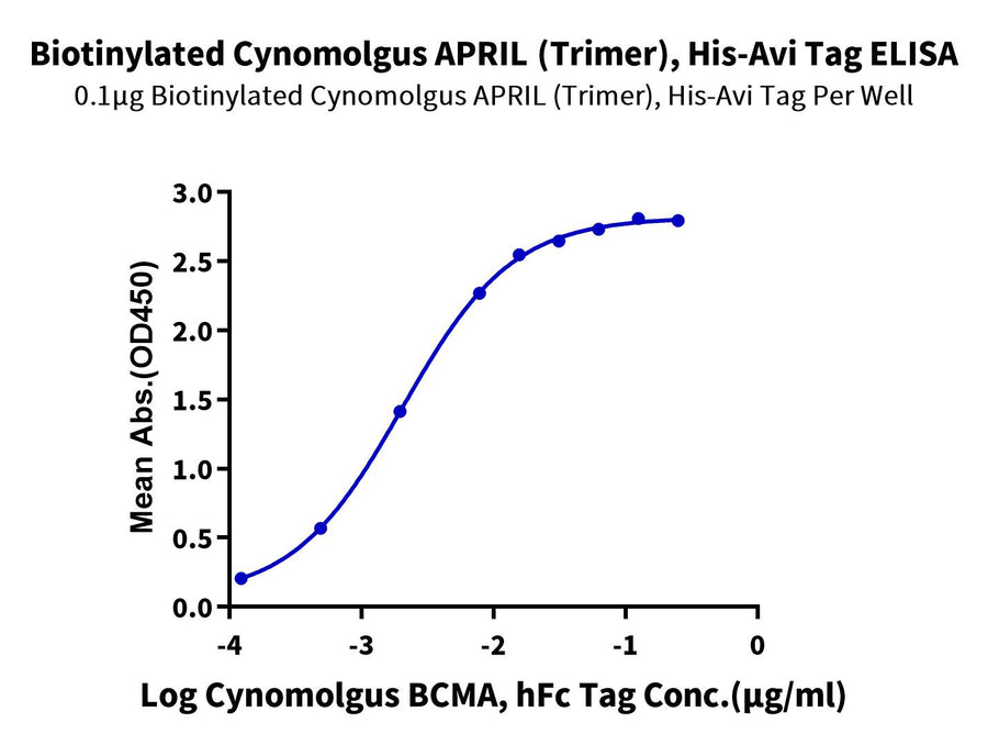 - Activity: Immobilized Biotinylated Cynomolgus APRIL (Trimer), His-Avi Tag at 1ug/ml (100ul/Well) on streptavidin (5ug/ml) precoated plate. Dose response curve for Cynomolgus BCMA, hFc Tag with the EC50 of 2.0ng/ml determined by ELISA.