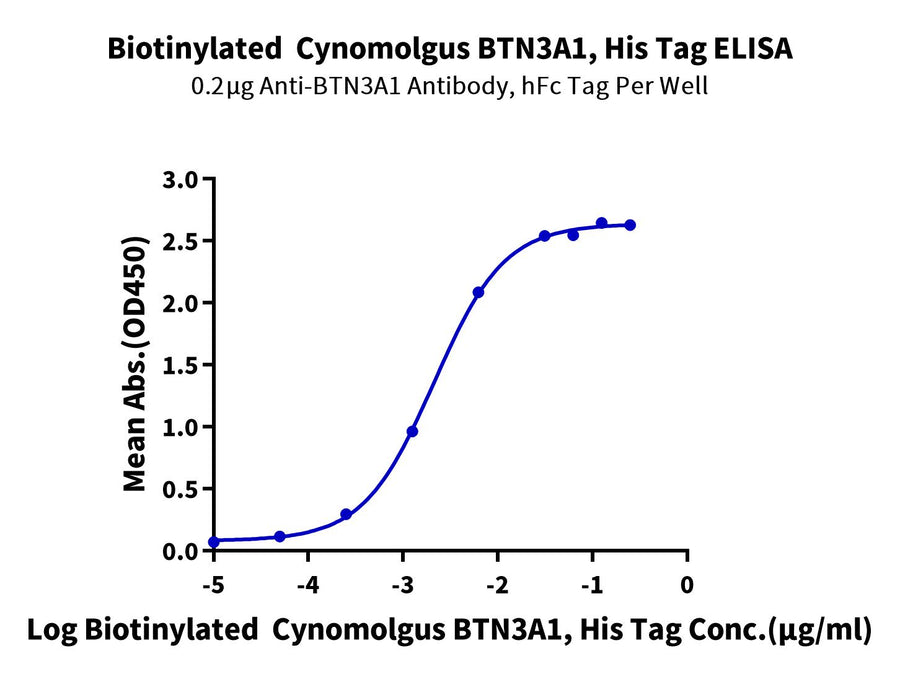 - Activity: Immobilized Anti-BTN3A1 Antibody, hFc Tag at 2ug/ml (100ul/well) on the plate. Dose response curve for Biotinylated Cynomolgus BTN3A1, His Tag with the EC50 of 2.1ng/ml determined by ELISA.
