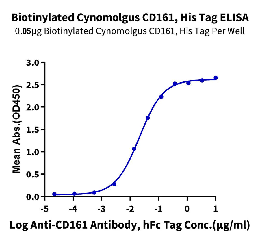 - Activity: Immobilized Biotinylated Cynomolgus CD161, His Tag at 0.5ug/ml (100ul/Well) on the streptavidin precoated plate (5ug/ml). Dose response curve for Anti-CD161 Antibody, hFc Tag with the EC50 of 21.2ng/ml determined by ELISA.