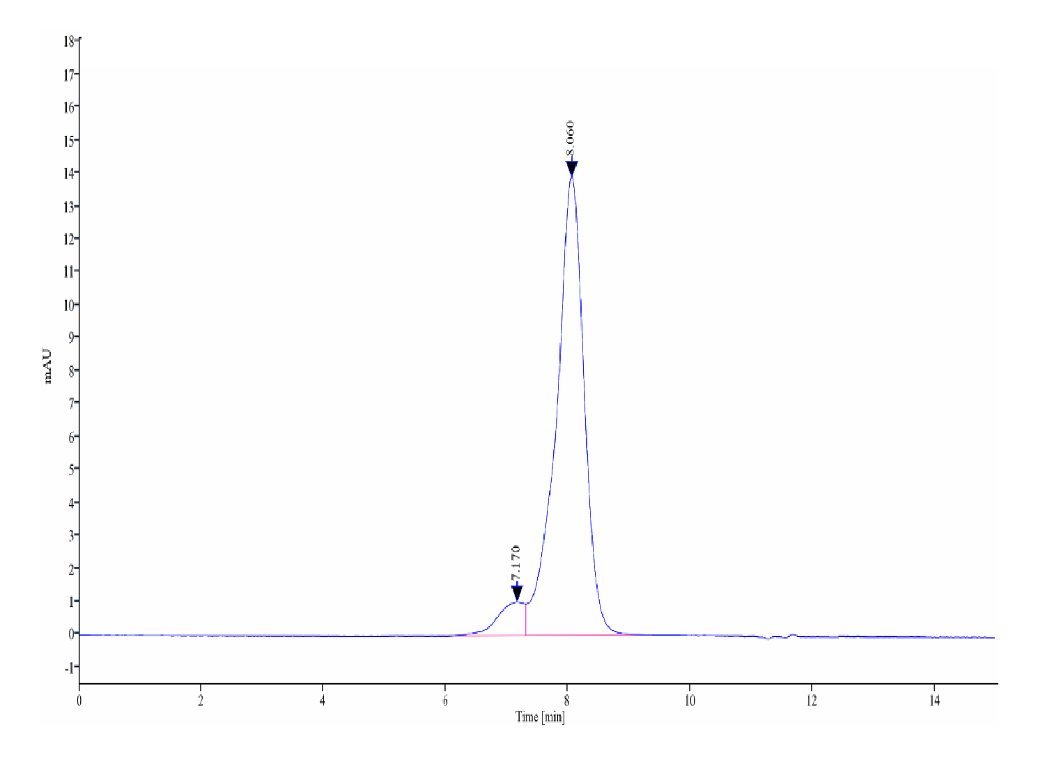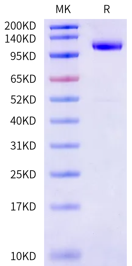 The protein has a predicted MW of 87.39 kDa. Due to glycosylation, the protein migrates to 110-130 kDa based on Bis-Tris PAGE result. |