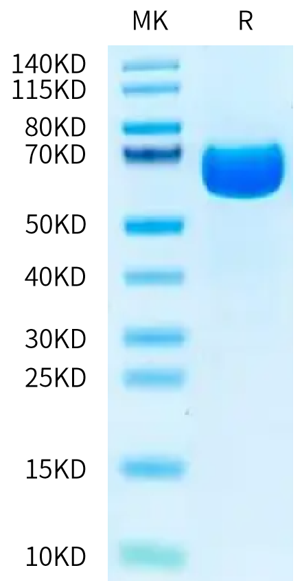 The protein has a predicted MW of 59.2 kDa. Due to glycosylation, the protein migrates to 55-70 kDa based on Bis-Tris PAGE result. |