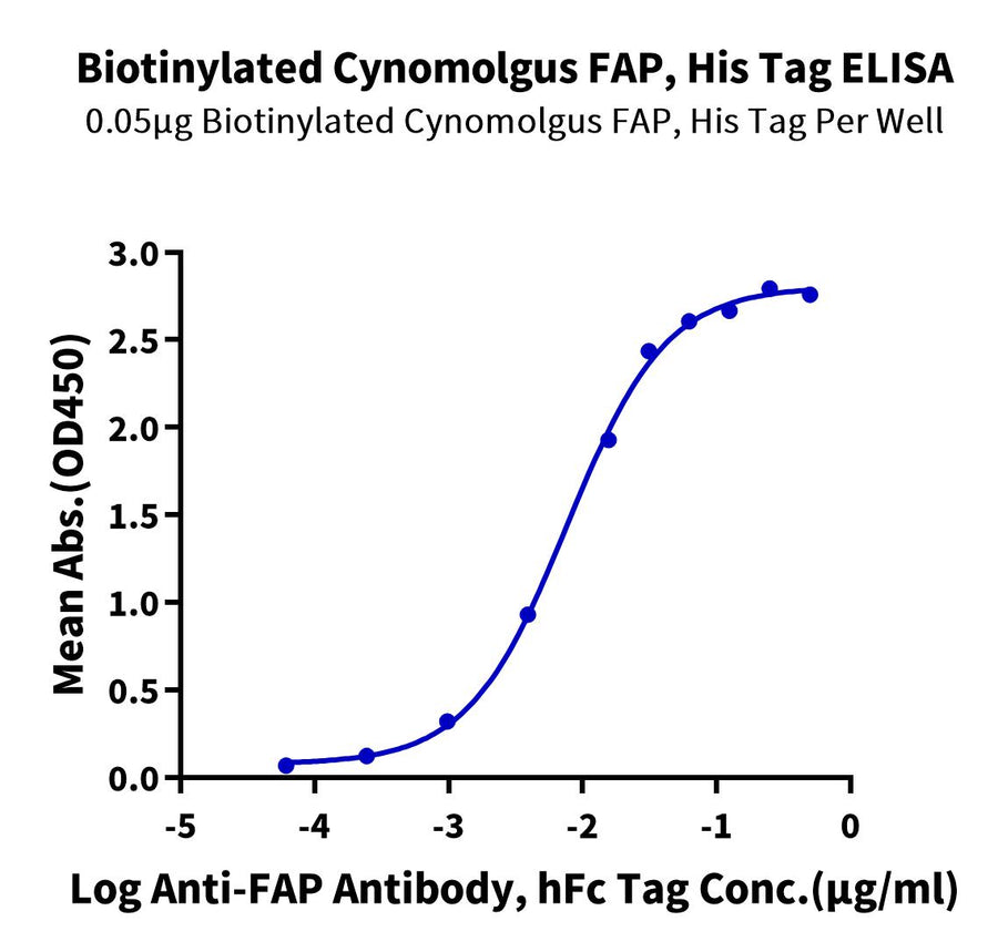 - Activity: Immobilized Biotinylated Cynomolgus FAP, His Tag at 0.5ug/ml (100ul/well) on the streptavidin precoated plate (5ug/ml). Dose response curve for Anti-FAP Antibody, hFc Tag with the EC50 of 7.7ng/ml determined by ELISA (QC Test).