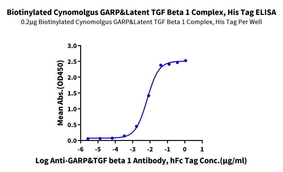 - Activity: Immobilized Biotinylated Cynomolgus GARP&Latent TGF Beta 1 Complex, His Tag at 2ug/ml (100ul/well) on the streptavidin precoated plate (5ug/ml). Dose response curve for Anti-GARP&TGF beta 1 Antibody, hFc Tag with the EC50 of 6.6ng/ml determined by ELISA.