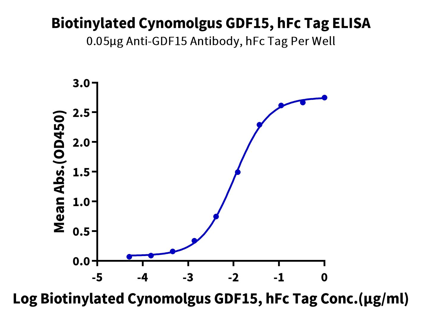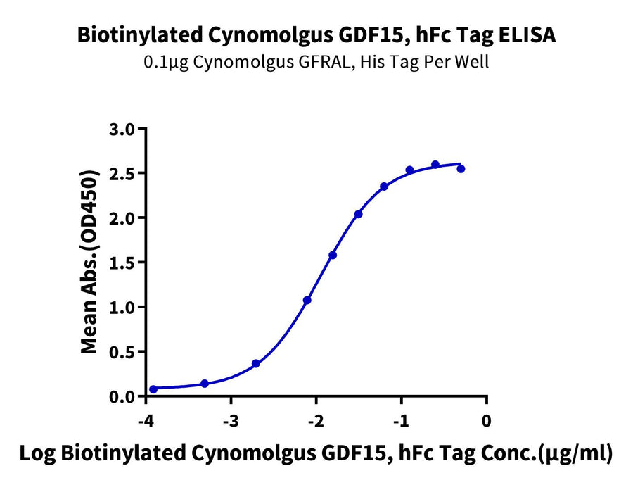 - Activity: Immobilized Cynomolgus GFRAL, His Tag at 1ug/ml (100ul/Well) on the plate. Dose response curve for Biotinylated Cynomolgus GDF15, hFc Tag with the EC50 of 11.4ng/ml determined by ELISA.