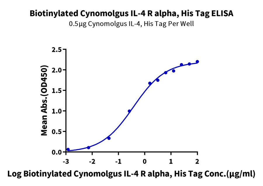 - Activity: Immobilized Cynomolgus IL-4, His Tag at 5ug/ml (100ul/well) on the plate. Dose response curve for Biotinylated Cynomolgus IL-4 R alpha, His Tag with the EC50 of 0.37ug/ml determined by ELISA (QC Test).