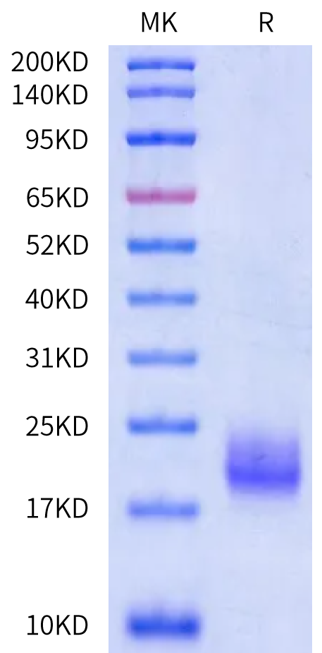 The protein has a predicted MW of 12.03 kDa. Due to glycosylation, the protein migrates to 18-25 kDa based on Bis-Tris PAGE result. |
