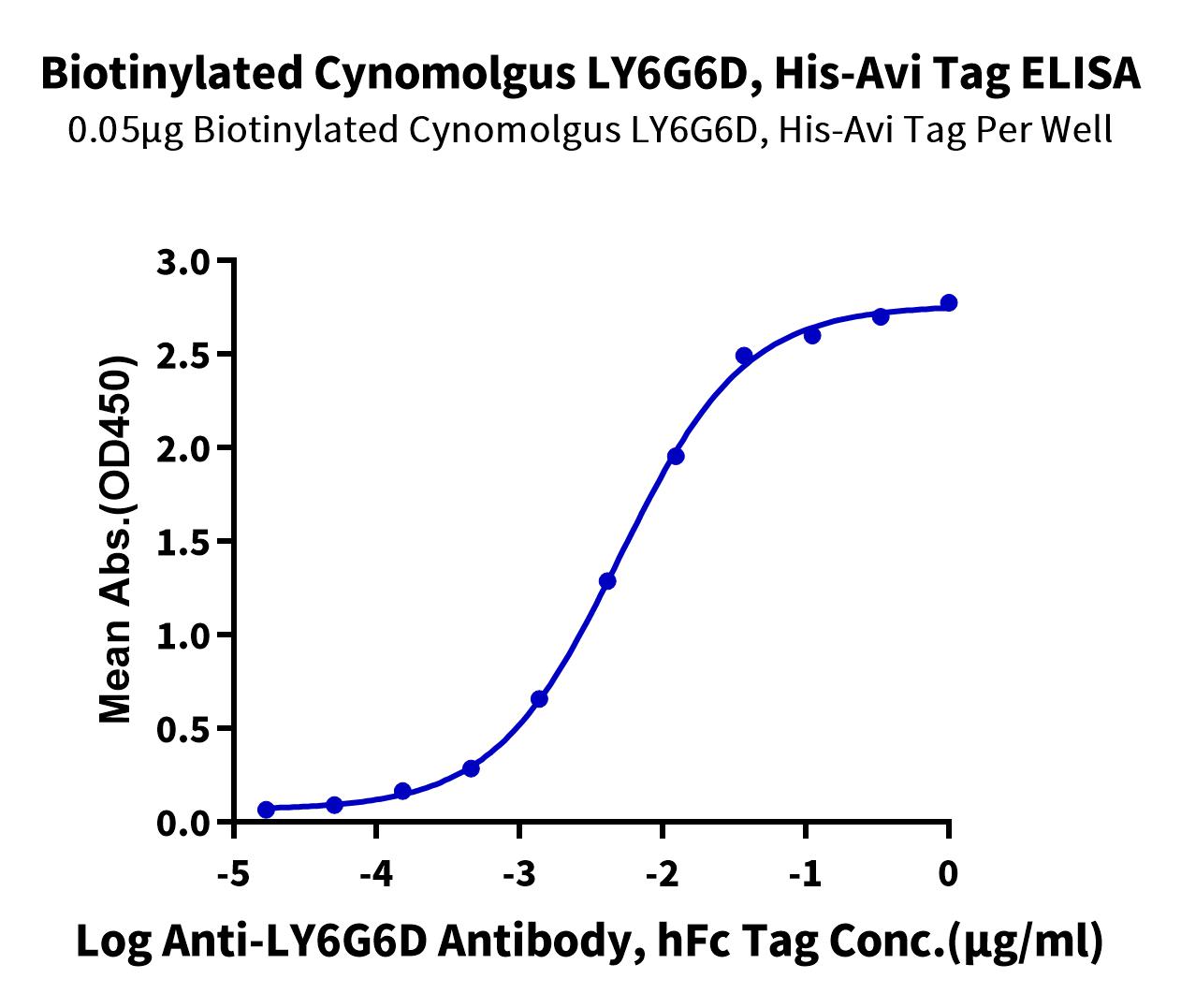Immobilized Biotinylated Cynomolgus LY6G6D, His-Avi Tag at 0.5ug/ml (100ul/Well) on streptavidin (5ug/ml) precoated plate. Dose response curve for Anti-LY6G6D Antibody, hFc Tag with the EC50 of 5.0ng/ml determined by ELISA. |