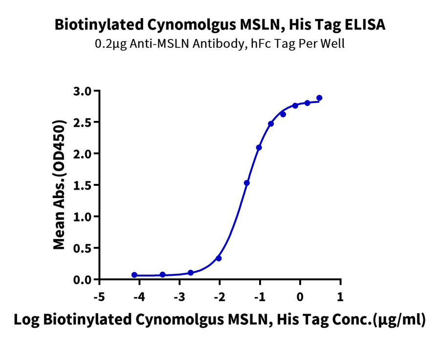 - Activity: Immobilized Biotinylated Cynomolgus MSLN, His Tag at 0.5ug/ml (100ul/well) on the streptavidin precoated plate (5ug/ml). Dose response curve for Anti-MSLN Antibody, hFc Tag with the EC50 of 3.3ng/ml determined by ELISA.