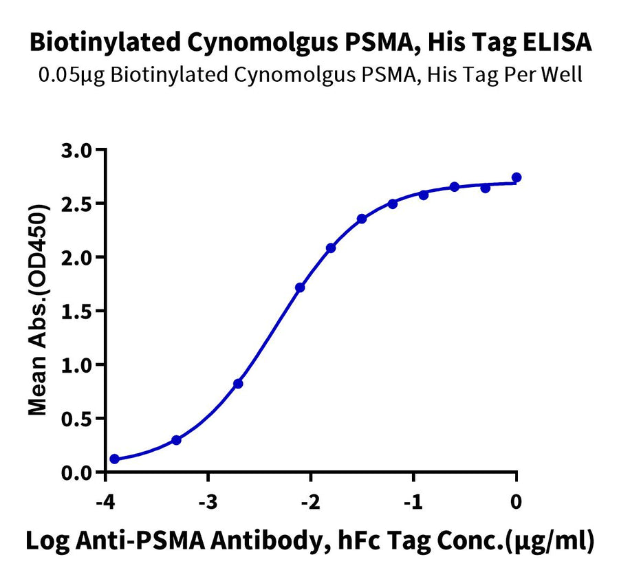 - Activity: Immobilized Biotinylated Cynomolgus PSMA, His Tag at 0.5ug/ml (100ul/Well) on streptavidin (5ug/ml) precoated plate. Dose response curve for Anti-PSMA Antibody, hFc Tag with the EC50 of 4.7ng/ml determined by ELISA (QC Test).