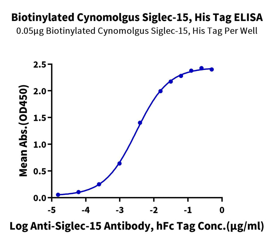 - Activity: Immobilized Biotinylated Cynomolgus Siglec-15, His Tag at 0.5ug/ml (100ul/well) on the streptavidin precoated plate (5ug/ml). Dose response curve for Anti-Siglec-15 Antibody, hFc Tag with the EC50 of 3.0ng/ml determined by ELISA (QC Test).