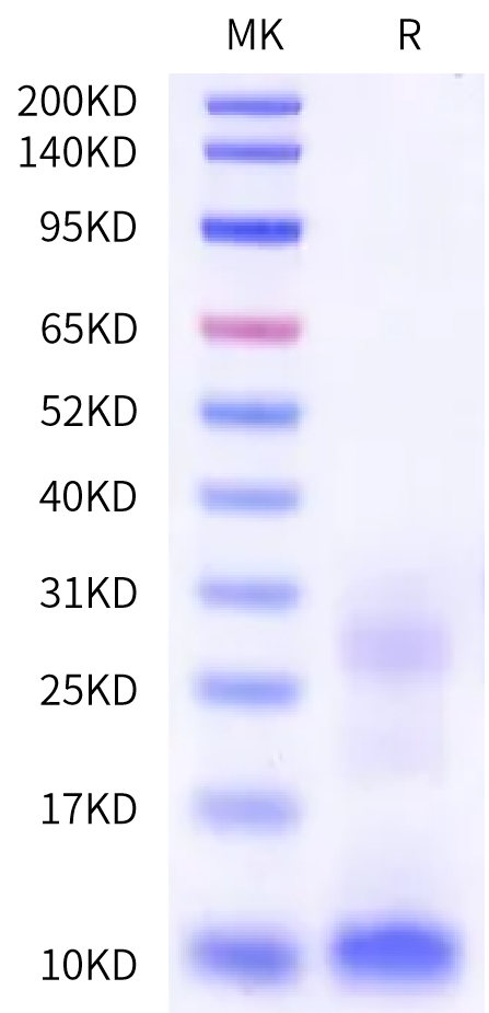 The protein has a predicted MW of 18.1 kDa. Due to the furin cleavage site, the protein migrates to 8-12 kDa, 18-22 kDa and 25-30 kDa based on Bis-Tris PAGE result. |