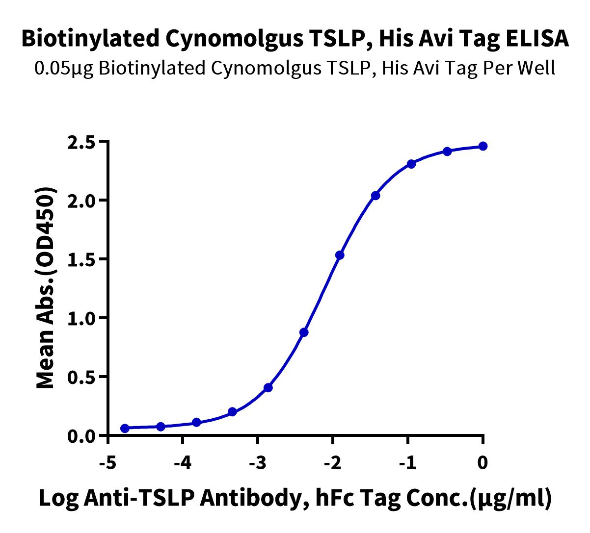 Immobilized Biotinylated Cynomolgus TSLP, His Avi Tag at 1ug/ml (100ul/well) on the streptavidin precoated plate (5ug/ml). Dose response curve for Human TSLPR, hFc Tag with the EC50 of 7.3ng/ml determined by ELISA. |