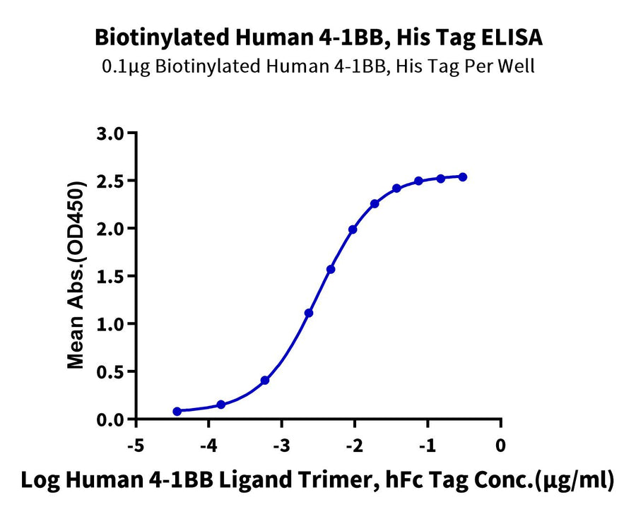 - Activity: Immobilized Biotinylated Human 4-1BB, His Tag at 1ug/ml (100ul/Well) on streptavidin (5ug/ml) precoated plate. Dose response curve for Human 4-1BB Ligand Trimer, hFc Tag with the EC50 of 5.9ng/ml determined by ELISA (QC Test).