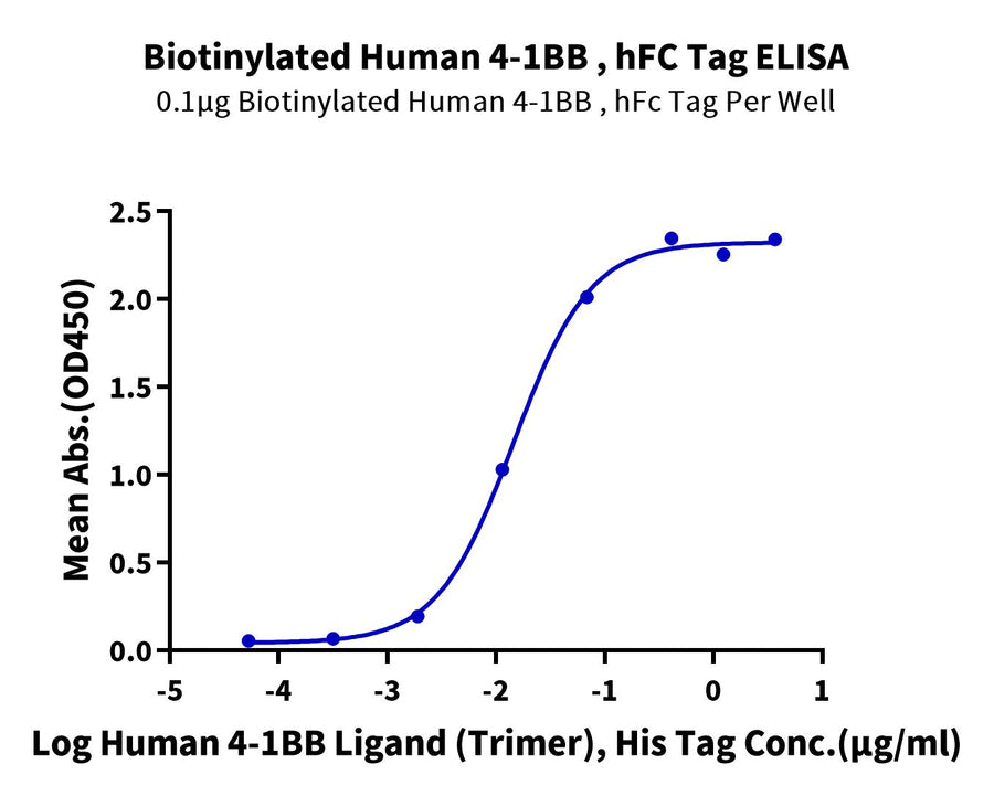 - Activity: Immobilized Biotinylated Human 4-1BB , hFc Tag at 1ug/ml (100ul/well) on the streptavidin precoated plate (5ug/ml). Dose response curve for Human 4-1BB Ligand (Trimer) , His Tag with the EC50 of 14.5ng/ml determined by ELISA.