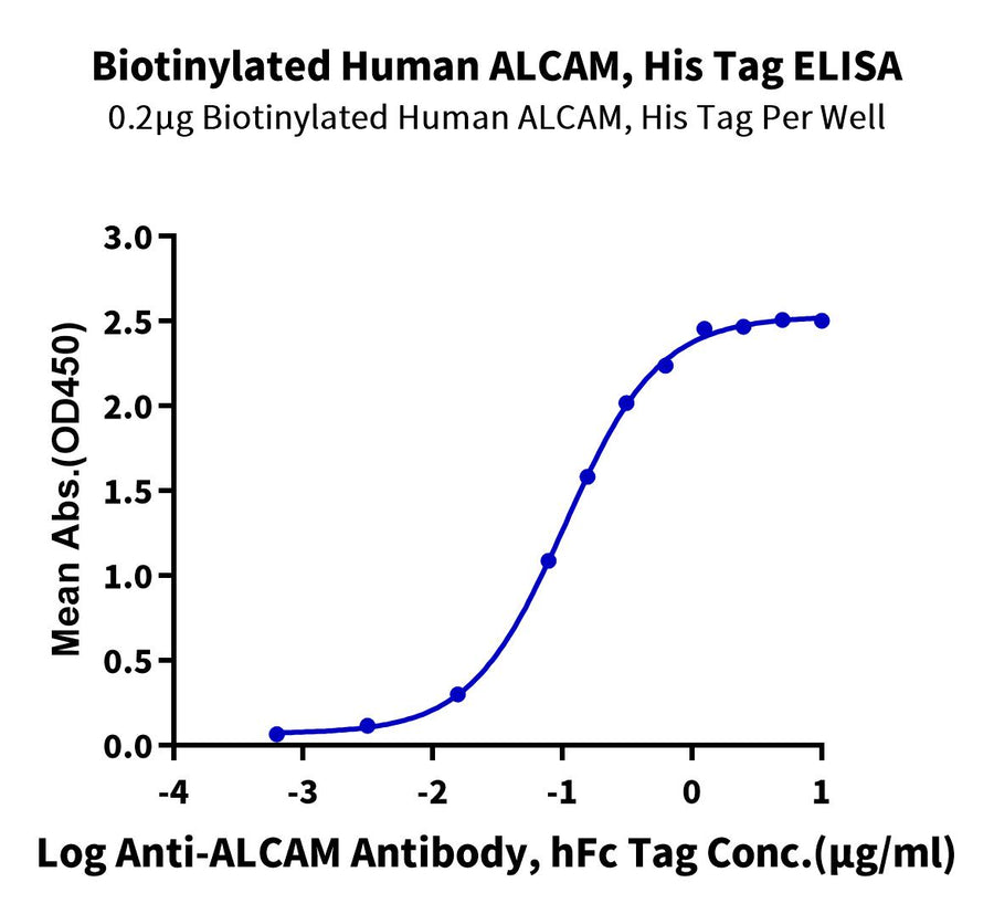 - Activity: Immobilized Biotinylated Human ALCAM, His Tag at 2ug/ml (100ul/well) on the streptavidin precoated plate (5ug/ml). Dose response curve for Anti-ALCAM Antibody, hFc Tag with the EC50 of 0.1ug/ml determined by ELISA (QC Test).