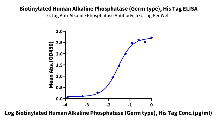 - Activity: Immobilized Anti-Alkaline Phosphatase Antibody, hFc Tag at 1ug/ml (100ul/well) on the plate. Dose response curve for Biotinylated Human Alkaline Phosphatase (Germ type), His-Avi Tag with the EC50 of 27.8ng/ml determined by ELISA. See testing image for detail.Measured by its ability to cleave a fluorogenic substrate, 4-Methylumbelliferyl phosphate (4-MUP). The specific activity is > 15000 pmol/min/µg.