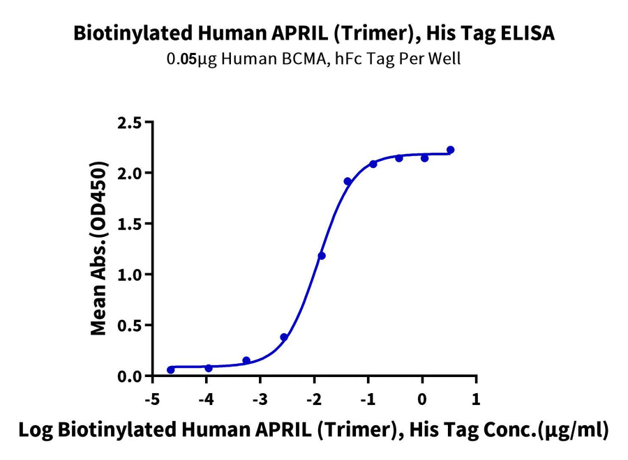 - Activity: Immobilized Human BCMA, hFc Tag at 0.5ug/ml (100ul/well) on the plate. Dose response curve for Biotinylated Human APRIL (Trimer) , His Tag with the EC50 of 11.9ng/ml determined by ELISA.
