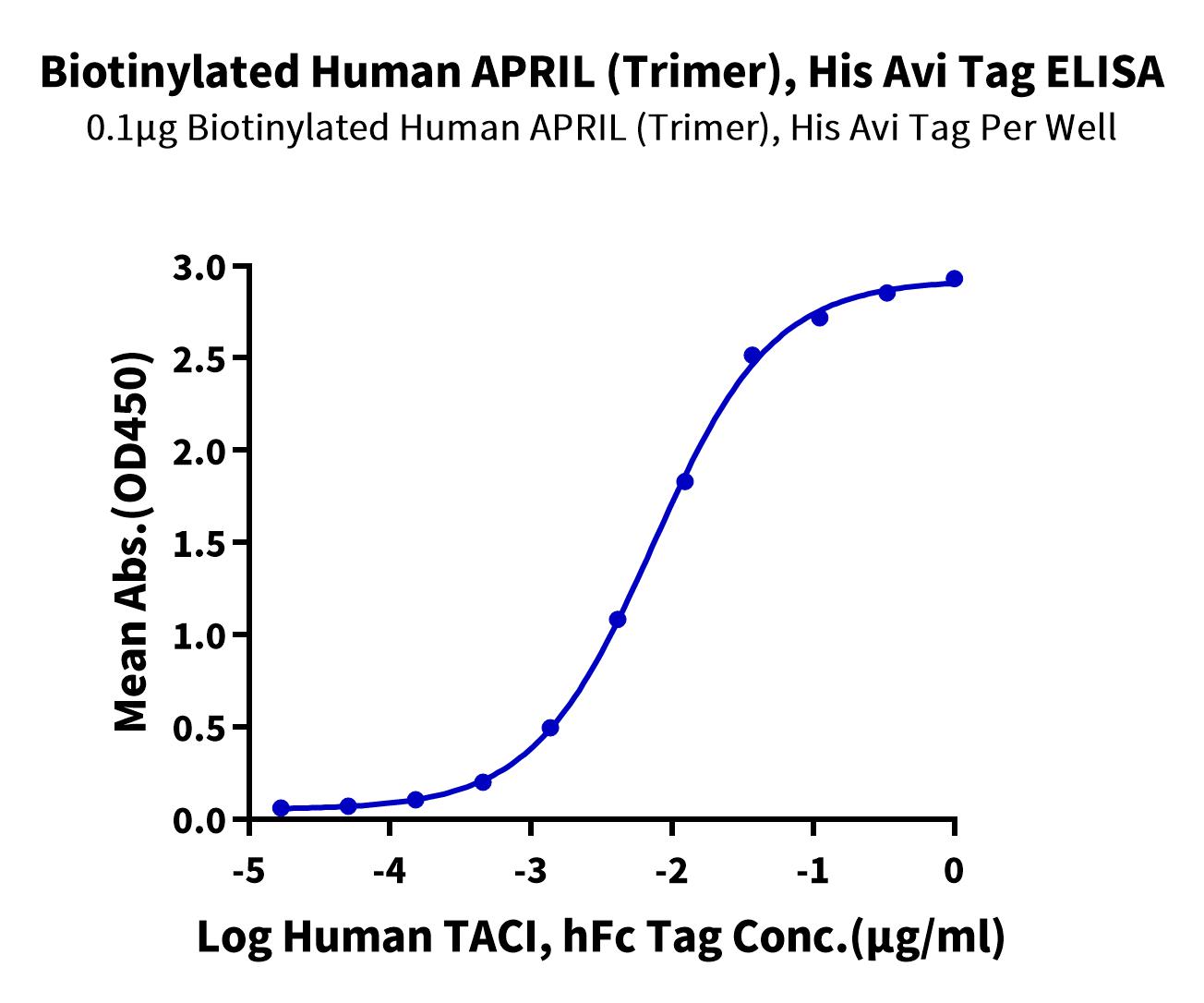 - Activity: Immobilized Human BCMA, hFc Tag (Cat. BCM-HM217) at 0.5ug/ml (100ul/well) on the plate. Dose response curve for Biotinylated Human APRIL (Trimer) , His Tag with the EC50 of 11.9ng/ml determined by ELISA.