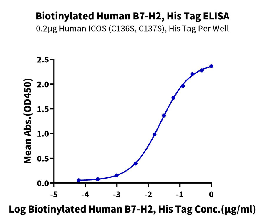 - Activity: Immobilized Human ICOS (C136S,C137S), His Tag at 2ug/ml (100ul/Well) on the plate. Dose response curve for Biotinylated Human B7-H2, His Tag with the EC50 of 25.1ng/ml determined by ELISA.