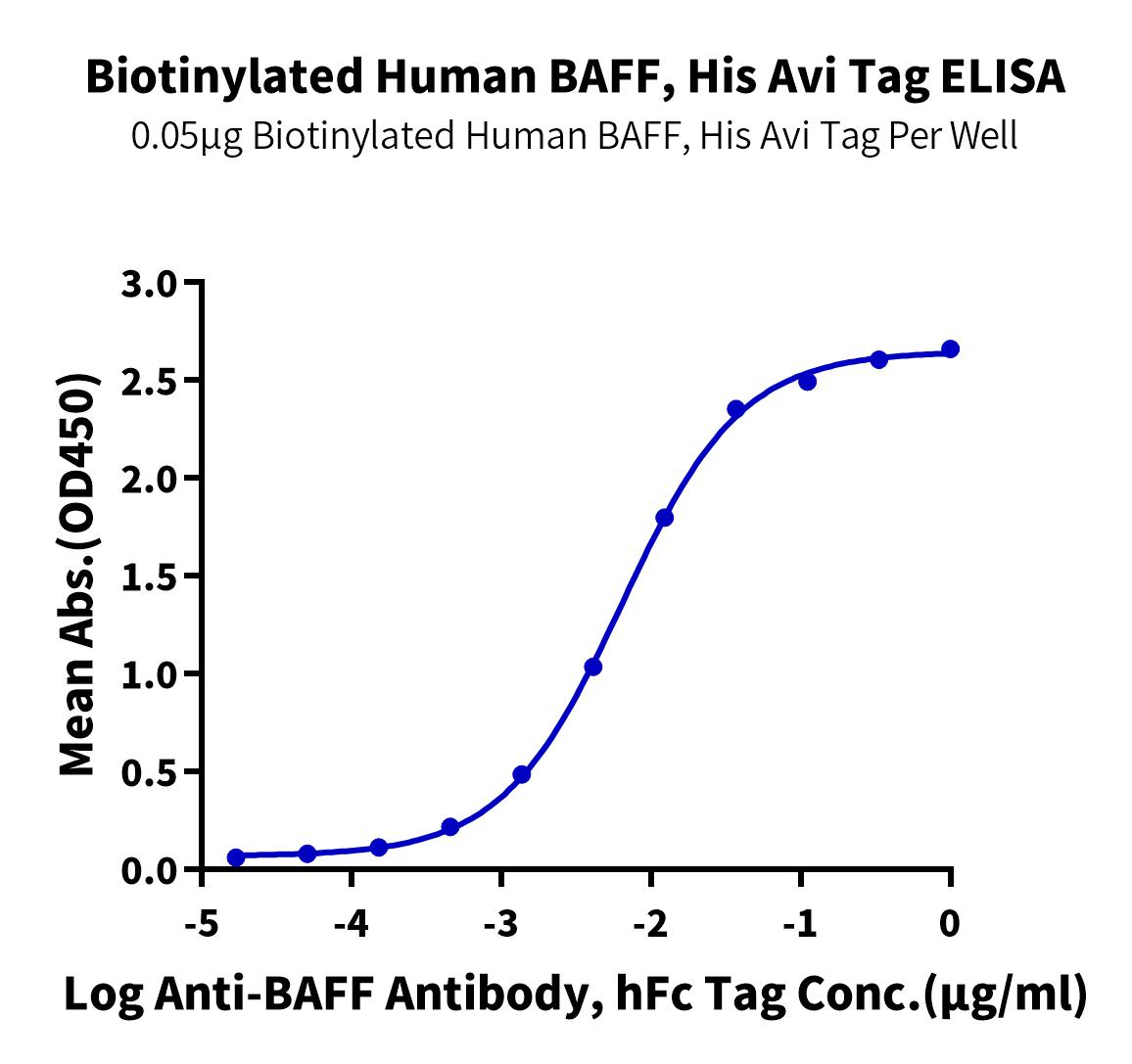 Immobilized Human BAFFR, His Tag at 2ug/ml (100ul/well) on the plate. Dose response curve for Biotinylated Human BAFF, His Tag with the EC50 of 8.0ng/ml determined by ELISA (QC Test). |