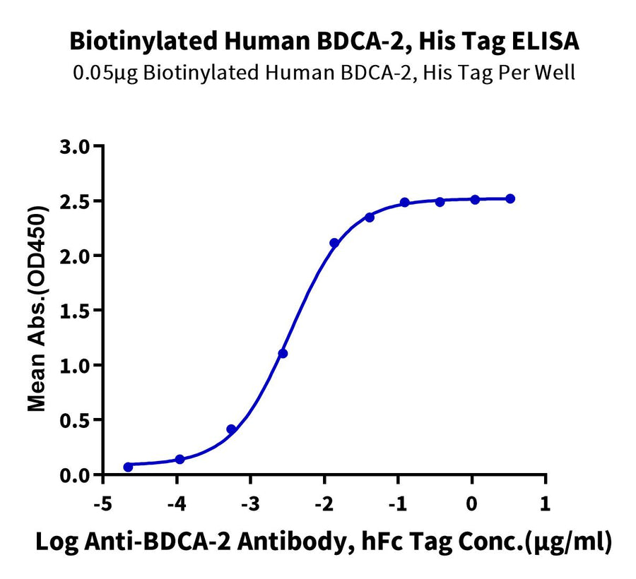 Immobilized Biotinylated Human BDCA-2, His Tag at 0.5ug/ml (100ul/Well) on streptavidin (5ug/ml) precoated plate. Dose response curve for Anti-BDCA-2 Antibody, hFc Tag with the EC50 of 3.5ng/ml determined by ELISA. |
