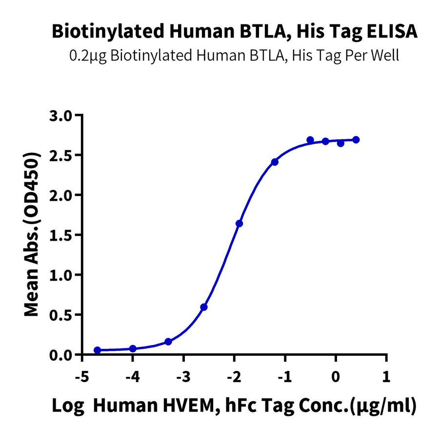 - Activity: Immobilized Biotinylated Human BTLA, His Tag at 2ug/ml(100ul/well) on the streptavidin precoated plate (5ug/ml). Dose response curve for Human HVEM, hFc Tag with the EC50 of 8.6ng/ml determined by ELISA (QC Test).