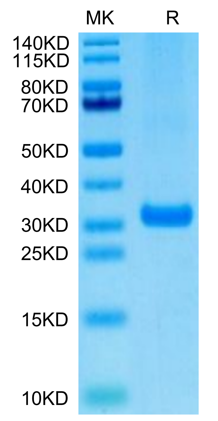 The protein has a predicted MW of 26.5 kDa. Due to glycosylation, the protein migrates to 30-38 kDa based on Bis-Tris PAGE result. |